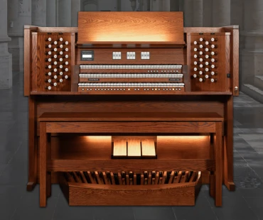 Órgano digital con audio en 6 canales, diseñado para ofrecer flexibilidad total al organista. Permite conectar altavoces y subwoofers adicionales, e incluye Centro de Control Personal para ajustar el sonido según preferencias individuales.