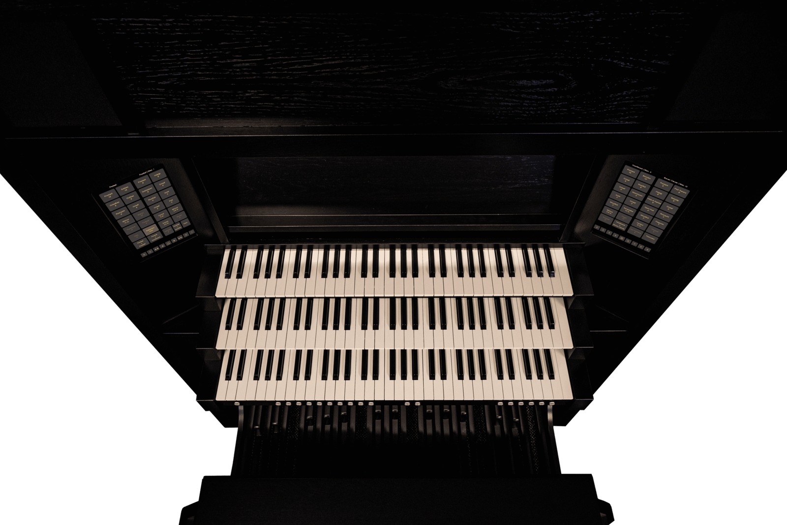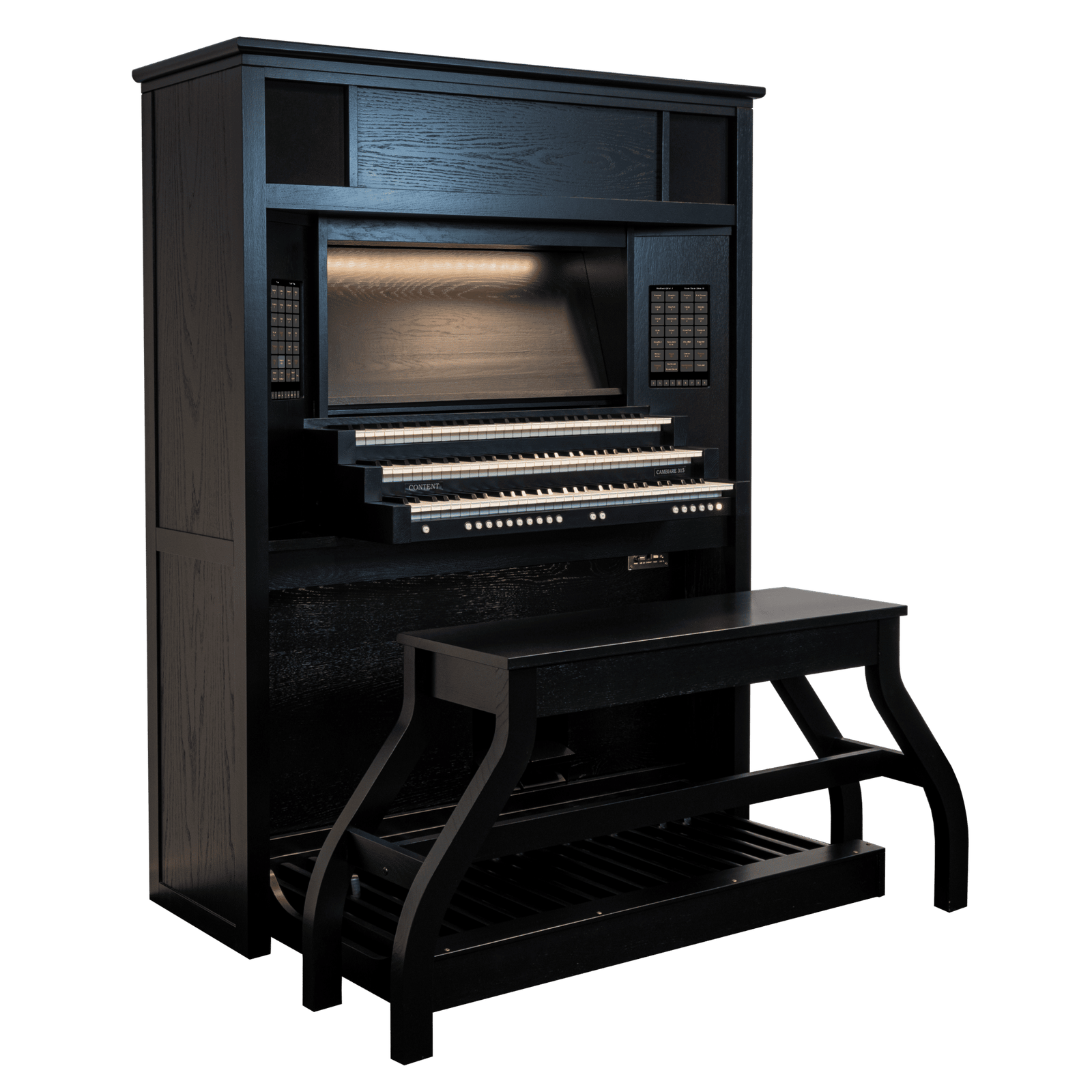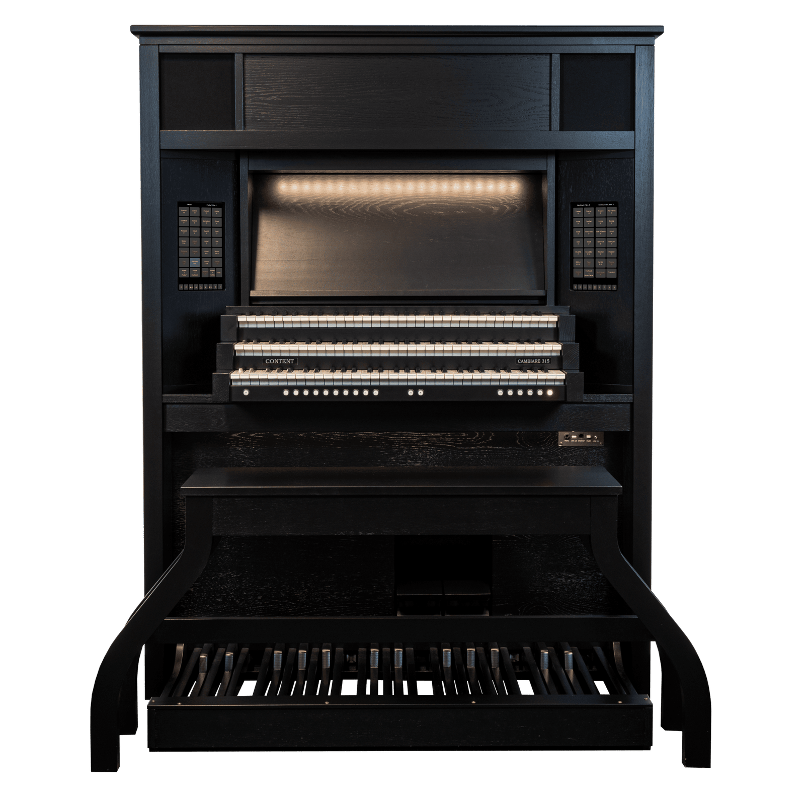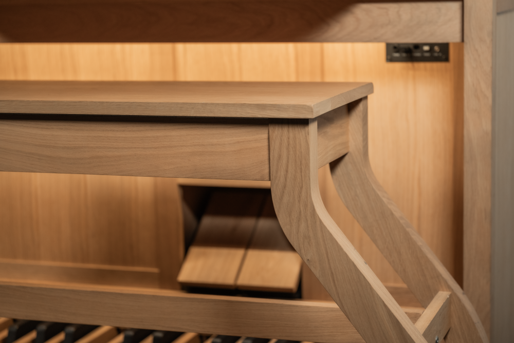 El gabinete moderno y con un diseño elegante le otorga al órgano el lugar que merece. Por supuesto, el gabinete del órgano puede ser realzado agregando una hermosa cornisa. La disposición de los altavoces en este gabinete proporciona una reproducción de sonido espaciosa. Como intérprete de órgano, te encuentras en medio del espacio, con el sonido proveniente tanto del frente como de la parte superior del gabinete. Este órgano también está equipado con sonido envolvente interno, que puede ser configurado de diversas maneras.