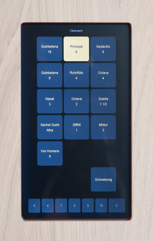 El uso de la Interfaz de Usuario de Content permite al usuario cambiar fácilmente entre juegos de muestras y presenta la disposición de diferentes órganos de manera uniforme. Esto también se aplica a la elección de temperamentos y varios bancos de memoria para preajustes. Además, nuestra Interfaz de Usuario de Content ofrece varias opciones de Hauptwerk (como grabar tu propia música de órgano). Todas estas funciones se pueden acceder cambiando de la pantalla de disposición a la pantalla de ajustes. Después de ajustar la configuración, iniciar una grabación o seleccionar el conjunto de muestras, puedes volver fácilmente a la disposición.