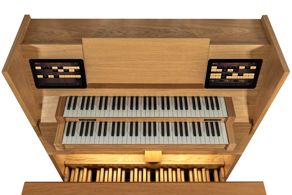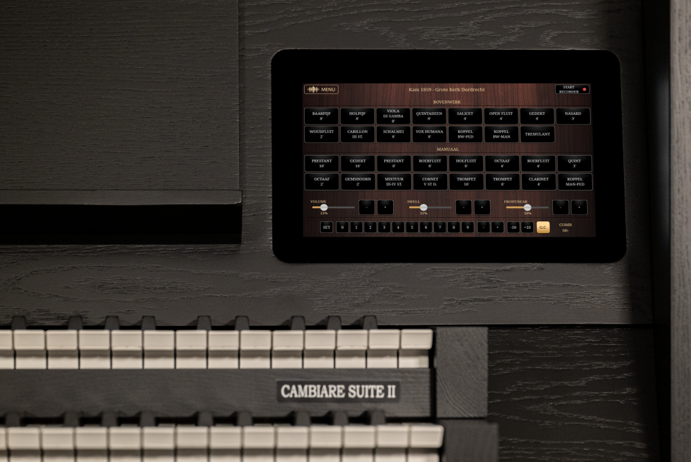 El Cambiare Suite II y el Suite III siempre están equipados con dos pantallas táctiles. Estas pantallas están integradas en el diseño de los muebles del órgano. Gracias al tamaño de estas pantallas, es posible mostrar completamente cada conjunto de muestras y controlarlo de manera conveniente. ¡Nunca había sido tan sencillo tocar varios órganos! Con botones simples, puedes cambiar entre diferentes conjuntos de muestras o agregar un nuevo conjunto de muestras. Sweelinq también brinda la oportunidad de grabar tu propia interpretación de órgano o de guardar y recuperar combinaciones seleccionadas (presets). Estos presets pueden ser recuperados opcionalmente utilizando pistones de pulgar iluminados.