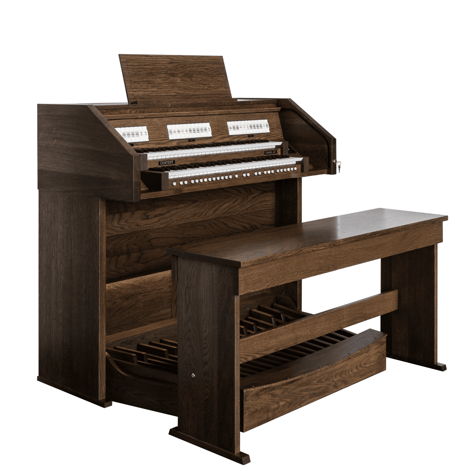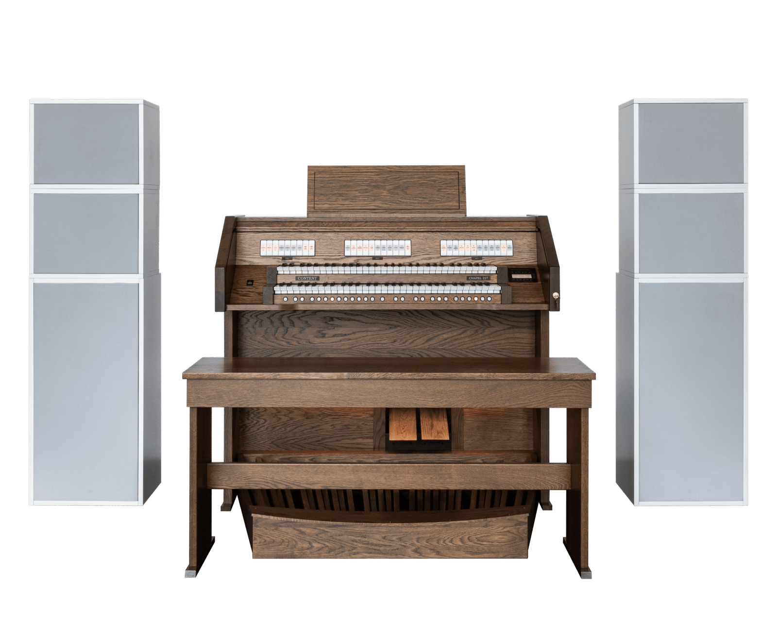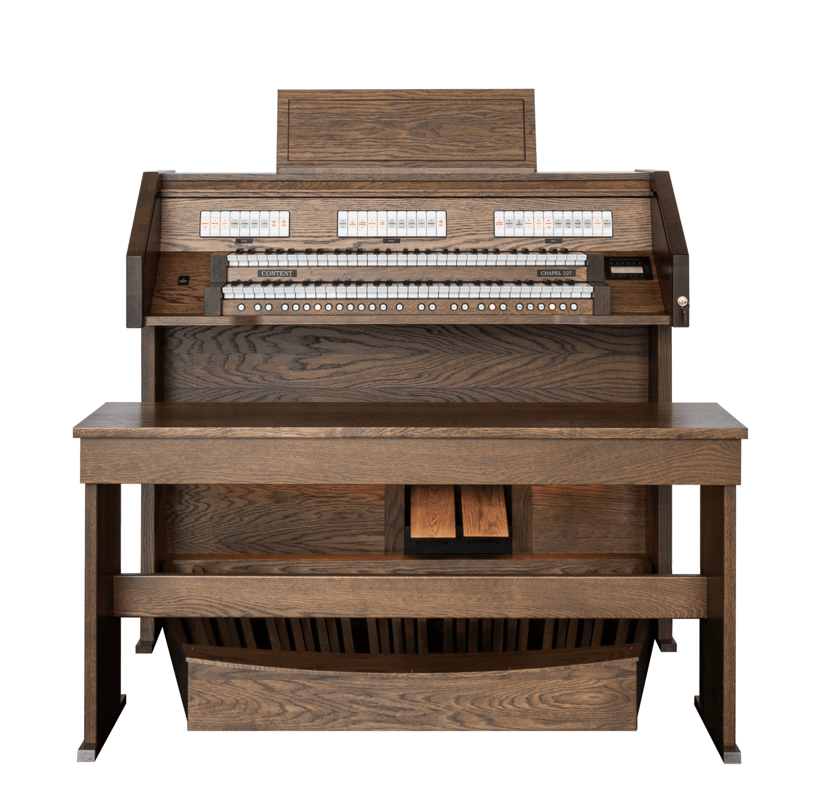 El modelo base en la serie de órganos de iglesia de Content Organs es el versátil Chapel 227R. Este órgano está equipado con dos teclados manuales y un pedal de 30 notas. El órgano cuenta con 27 registros con alta calidad de sonido. El pedal, equipado con 7 registros de pedal, proporciona una base sólida debajo de la también muy robusta división Great. Con la extensa división Swell, el organista tiene la oportunidad de crear dinámicas o tocar con diversos colores tonales.