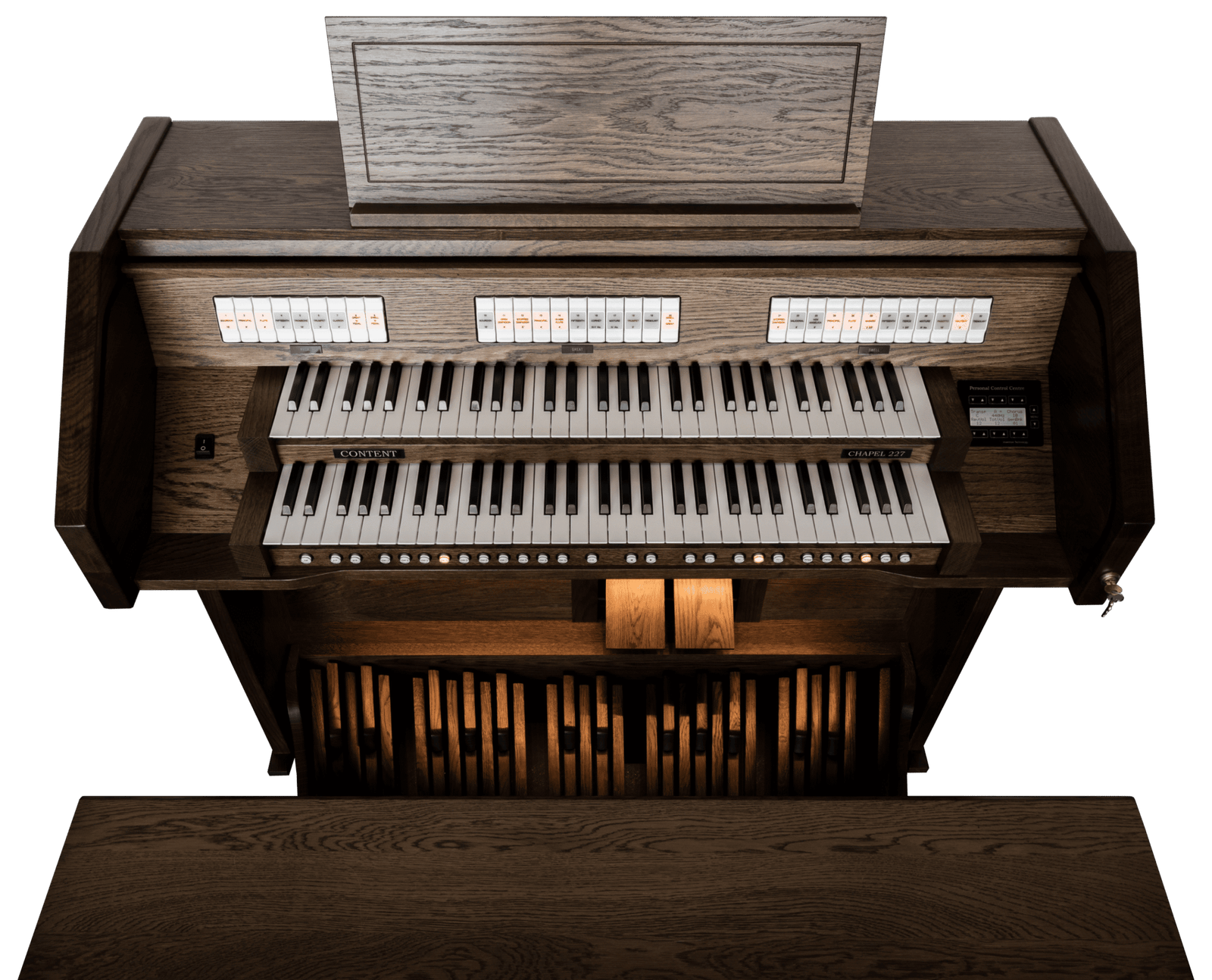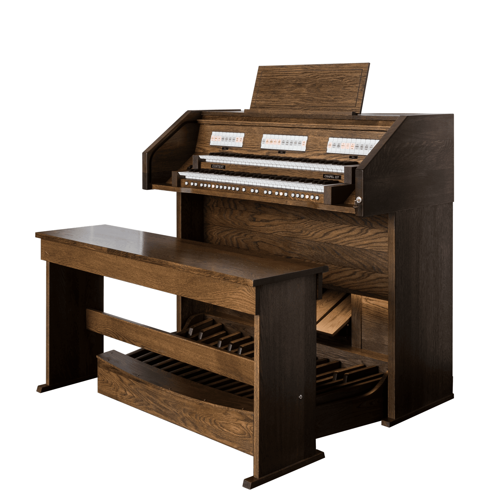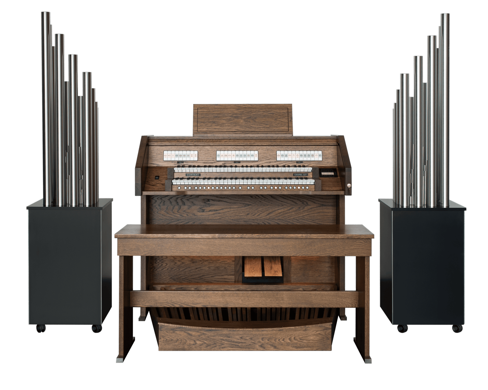 El modelo base en la serie de órganos de iglesia de Content Organs es el versátil Chapel 227R. Este órgano está equipado con dos teclados manuales y un pedal de 30 notas. El órgano cuenta con 27 registros con alta calidad de sonido. El pedal, equipado con 7 registros de pedal, proporciona una base sólida debajo de la también muy robusta división Great. Con la extensa división Swell, el organista tiene la oportunidad de crear dinámicas o tocar con diversos colores tonales.