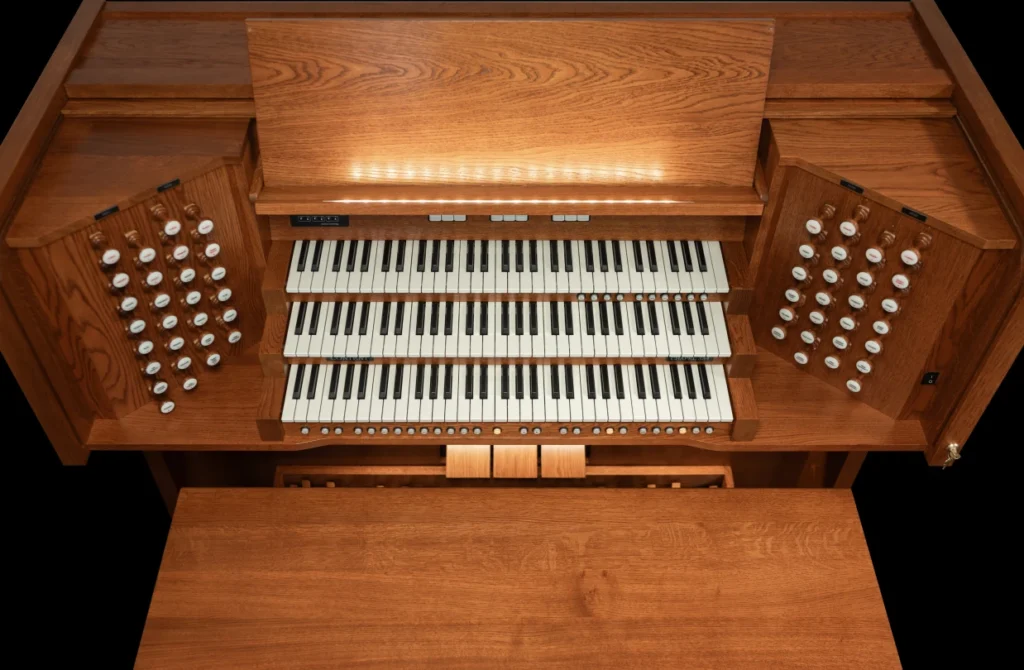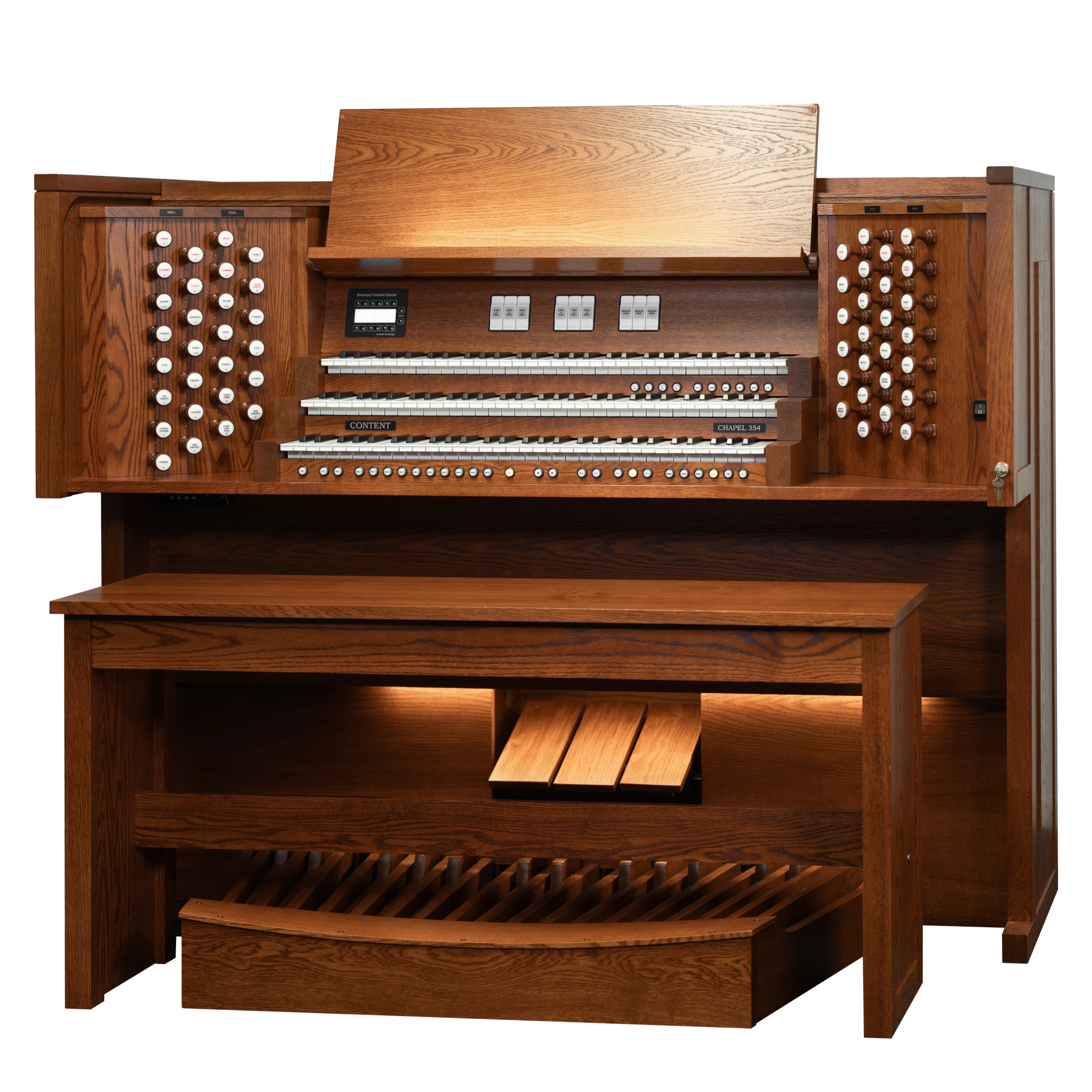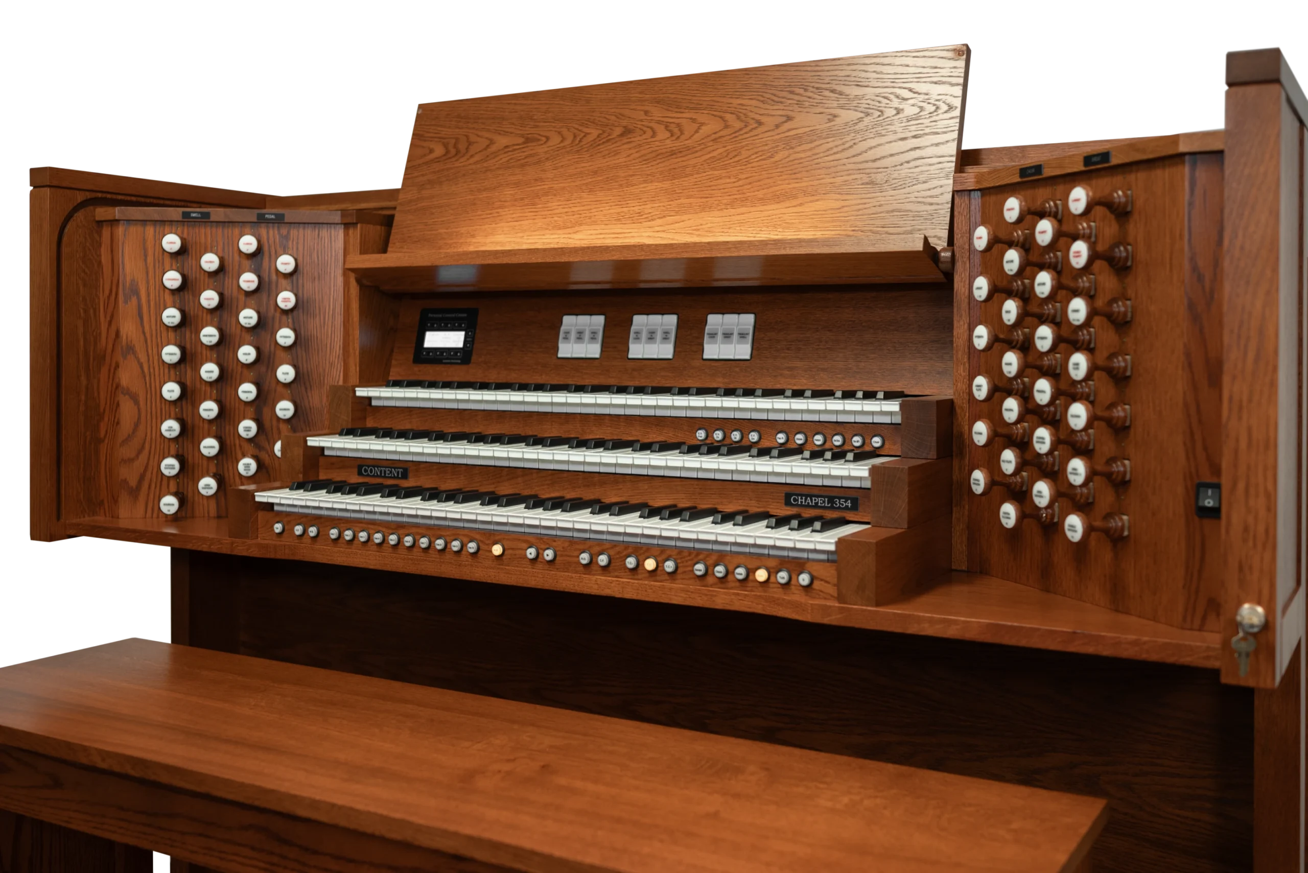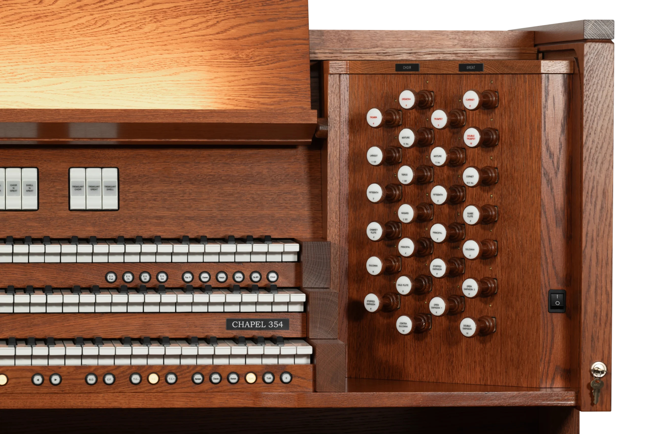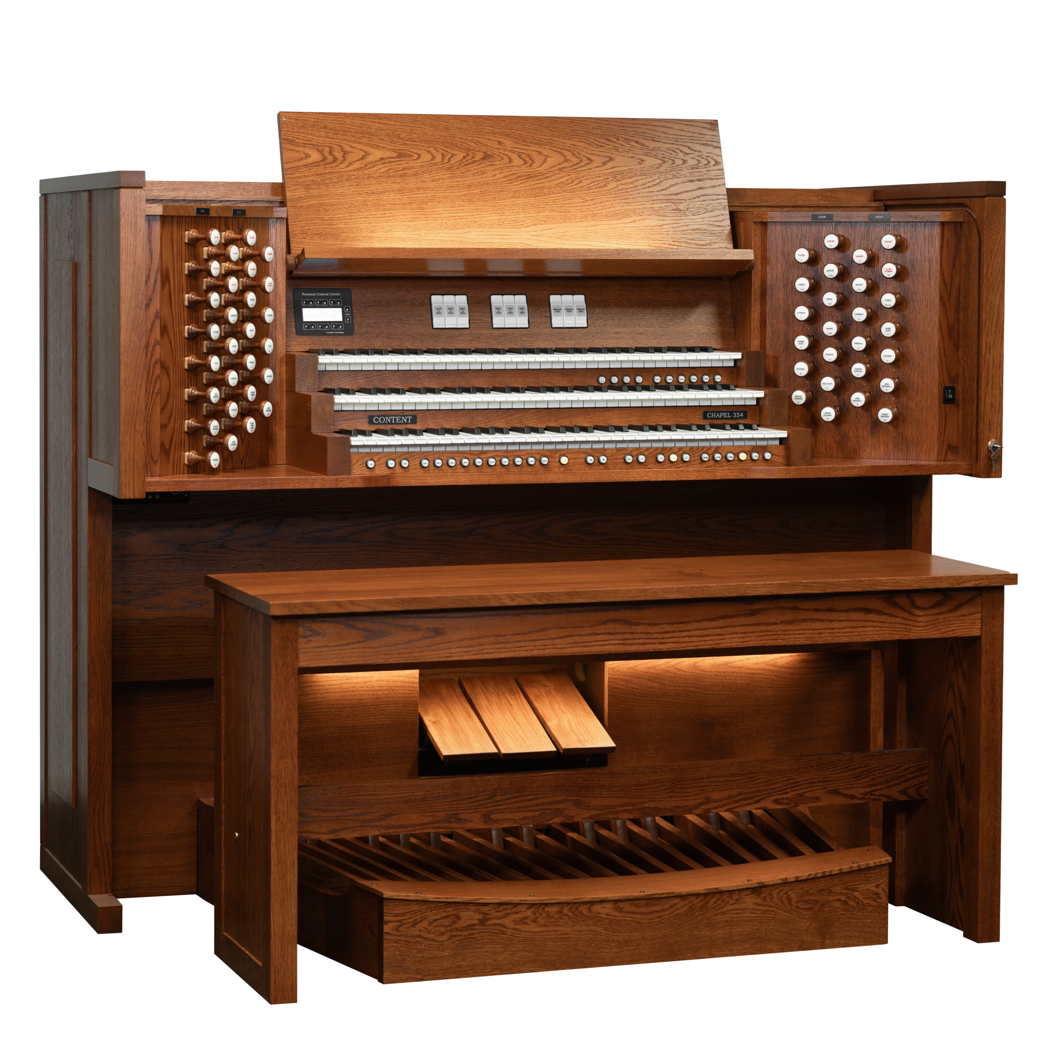 El Chapel 354R reúne todo de manera óptima. Este modelo en una sólida consola de órgano de roble se entrega de serie con tiradores de madera a ambos lados de los manuales. Esto proporciona al modelo la experiencia óptima de un órgano de tubos. Varias variantes de pedal, banco y manual completan el confort para cada organista. Además, este órgano cuenta con el avanzado sistema de audio Content Chapel, con altavoces de monitor incorporados como opciones para espacios más grandes.