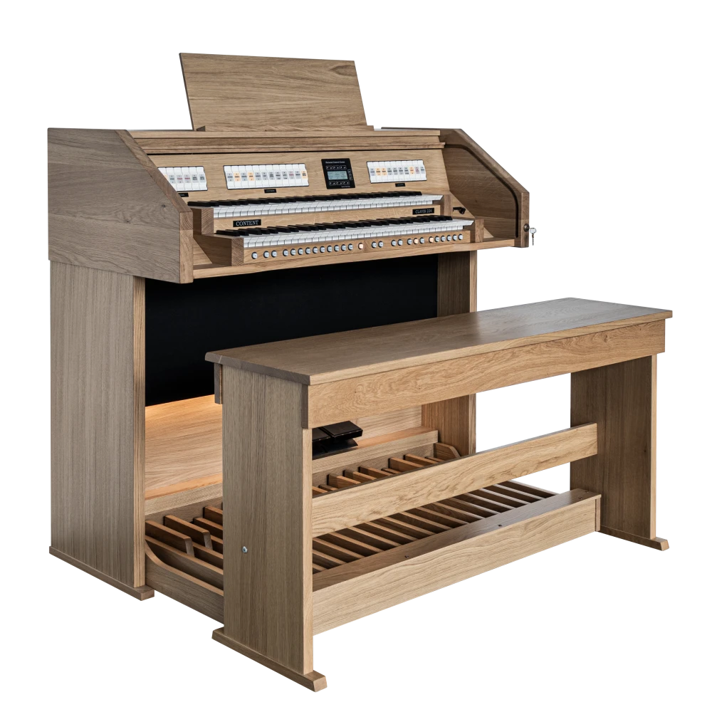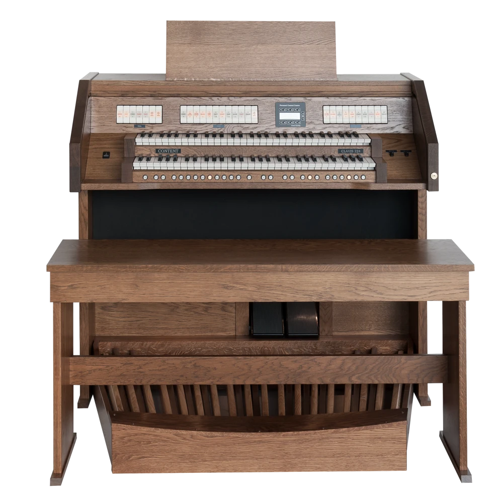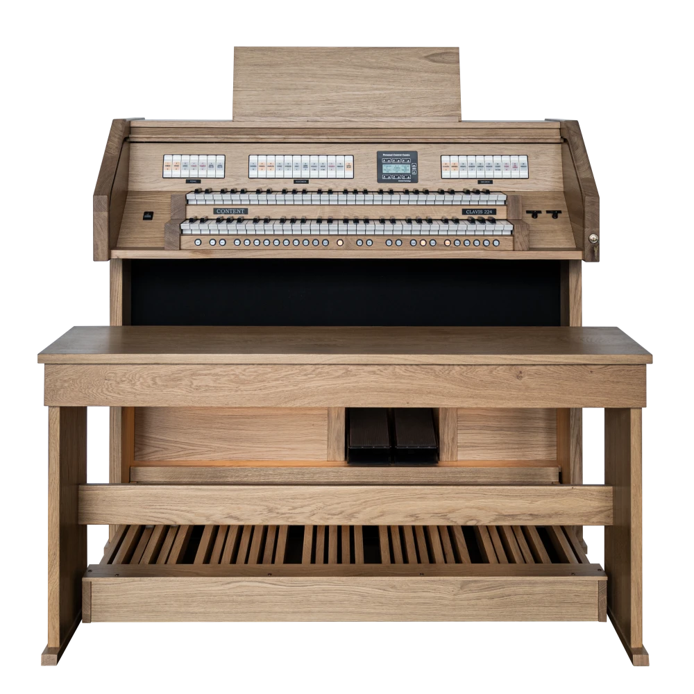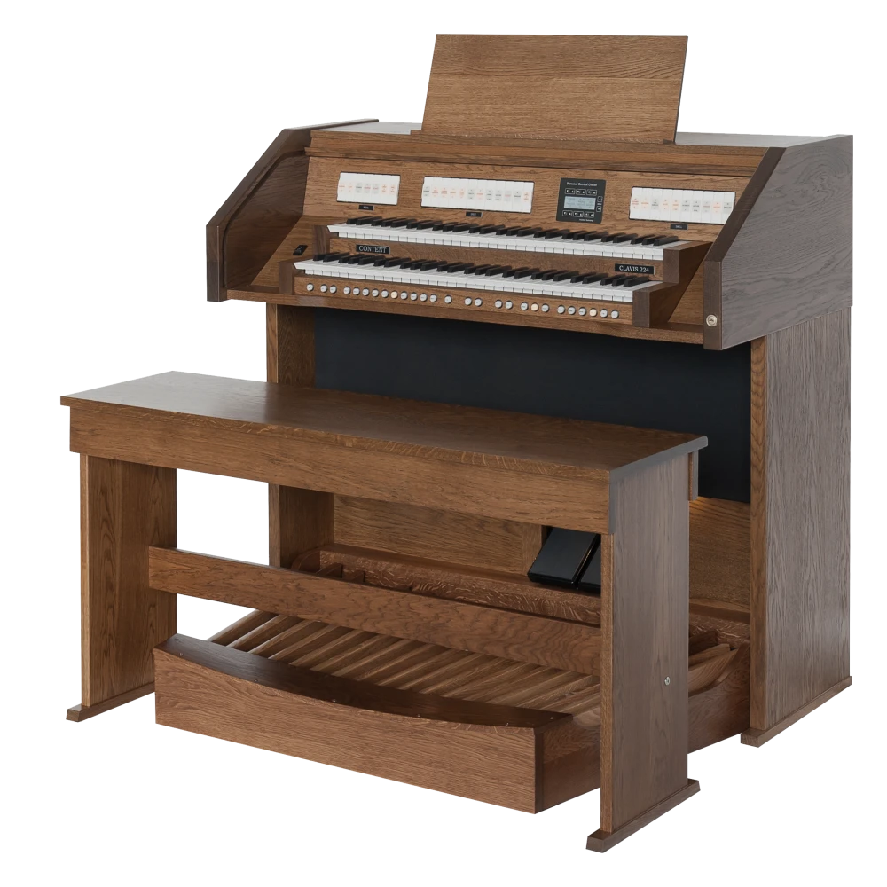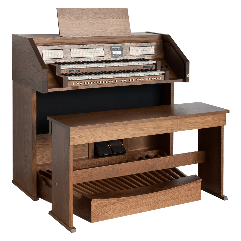El Content Clavis 224 es ampliamente conocido como un órgano asequible sin comprometer la calidad y el acabado. El mueble del órgano está hecho de roble (macizo) y está disponible en cualquier color (de tinte) deseado. Con dos pedales de expresión, puedes crear una dinámica tonal óptima. Naturalmente, el órgano está equipado con iluminación LED en la pedalera, y el banco de madera maciza viene con un compartimento de almacenamiento para partituras.