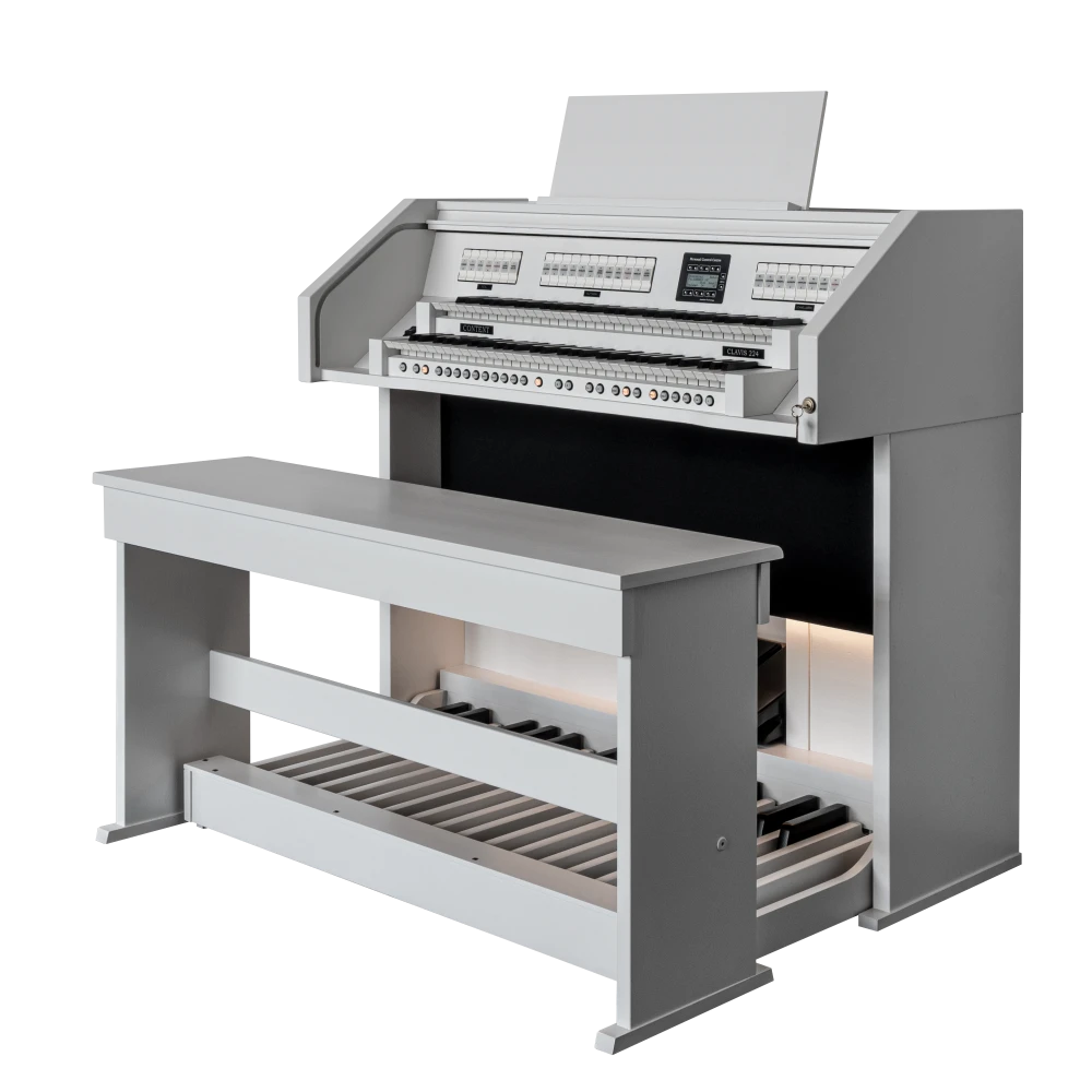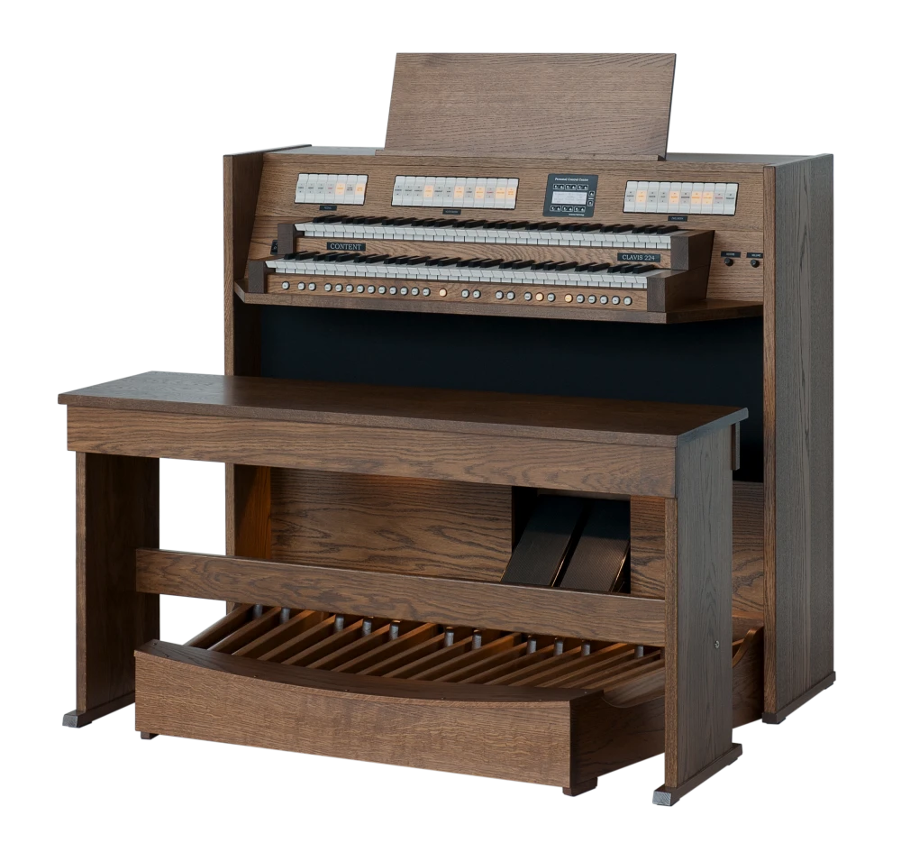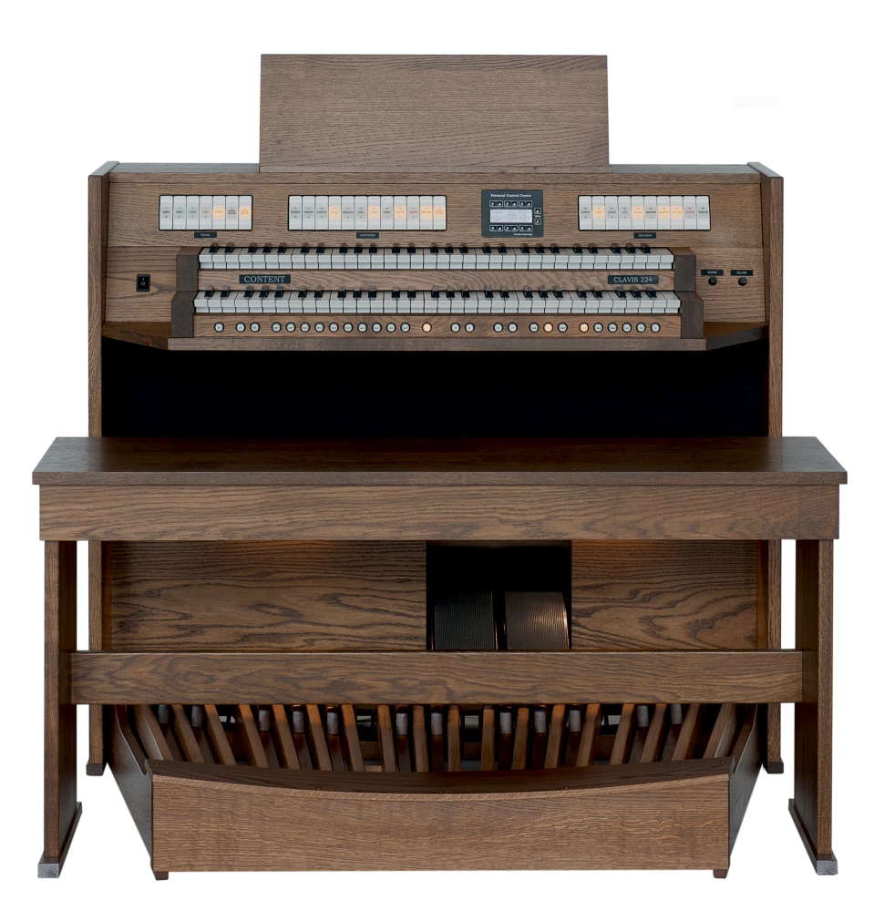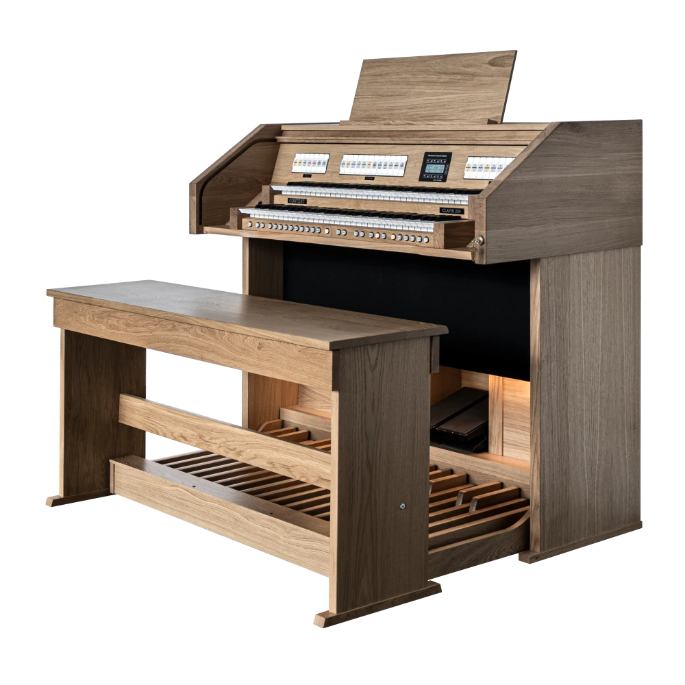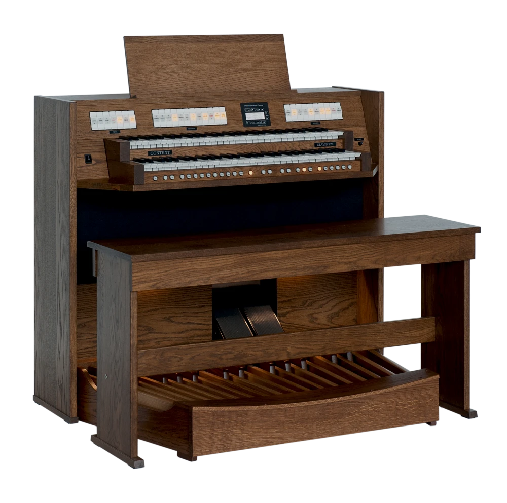 El Content Clavis 224 es ampliamente conocido como un órgano asequible sin comprometer la calidad y el acabado. El mueble del órgano está hecho de roble (macizo) y está disponible en cualquier color (de tinte) deseado. Con dos pedales de expresión, puedes crear una dinámica tonal óptima. Naturalmente, el órgano está equipado con iluminación LED en la pedalera, y el banco de madera maciza viene con un compartimento de almacenamiento para partituras.
