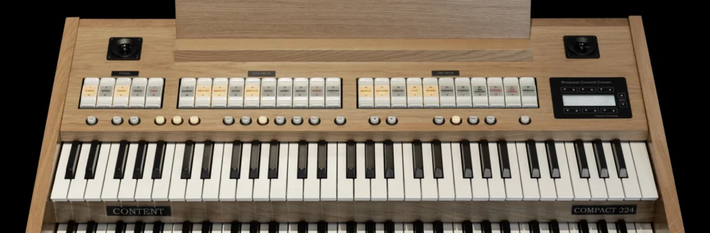 Debido a la multitud de opciones para usar el Compact 224, el órgano está disponible con varias opciones y características. La configuración interna estándar incluye amplificadores de 30 vatios. Una opción es actualizar a amplificadores de 4×180 vatios y adquirir adicionalmente el sistema de audio de alta gama de Content (Home 8). Esto le proporciona la experiencia de sonido más óptima en el espacio donde desee colocar el órgano, como en pequeñas iglesias y capillas o en conservatorios. Por supuesto, también es posible conectar sus propios altavoces o tocar con auriculares. Además, puede expandir el órgano con una pedalera, un pedal de crescendo y/o un banco, incluido el soporte de metal o madera correspondiente. De esta manera, puede personalizar su propio órgano compacto de manera flexible.