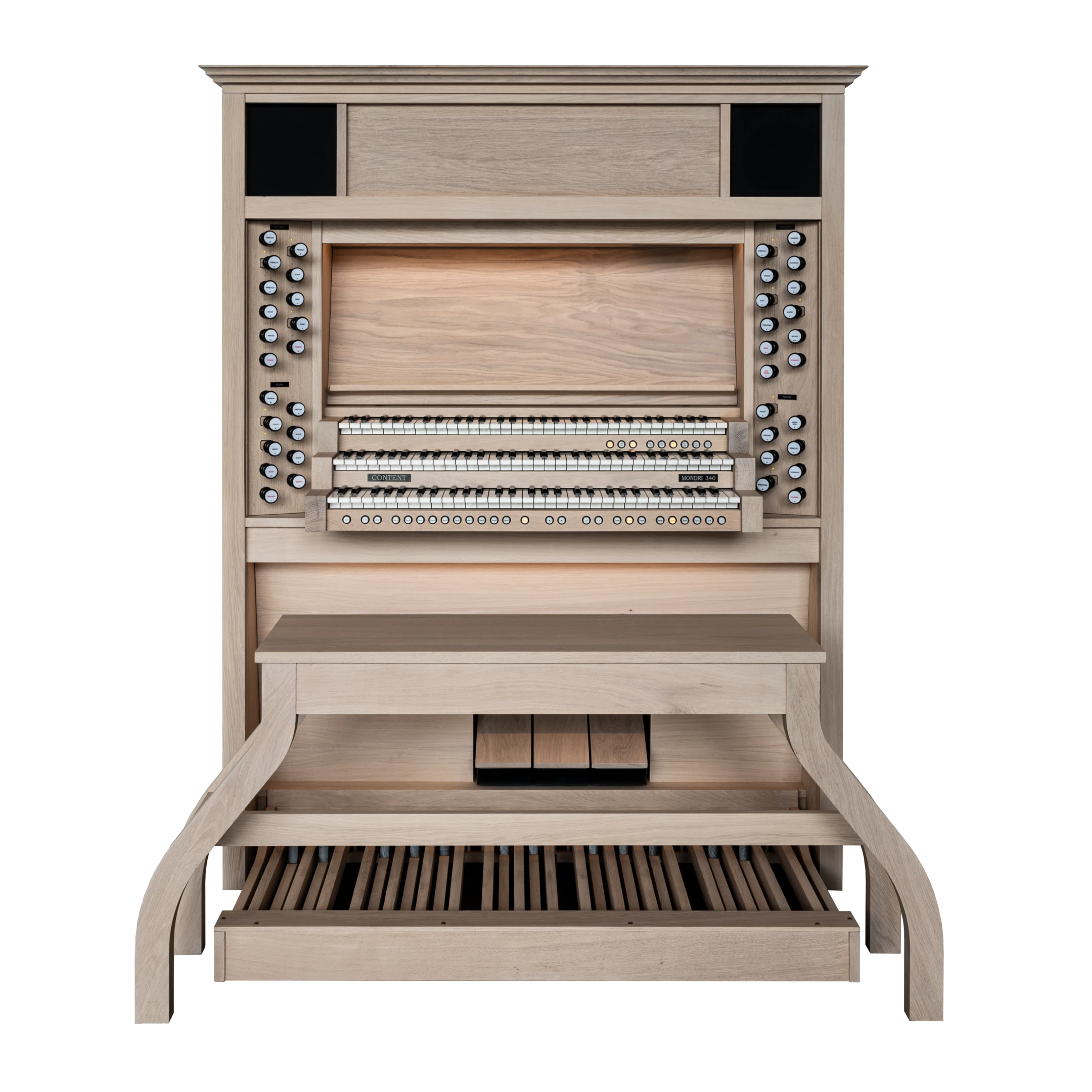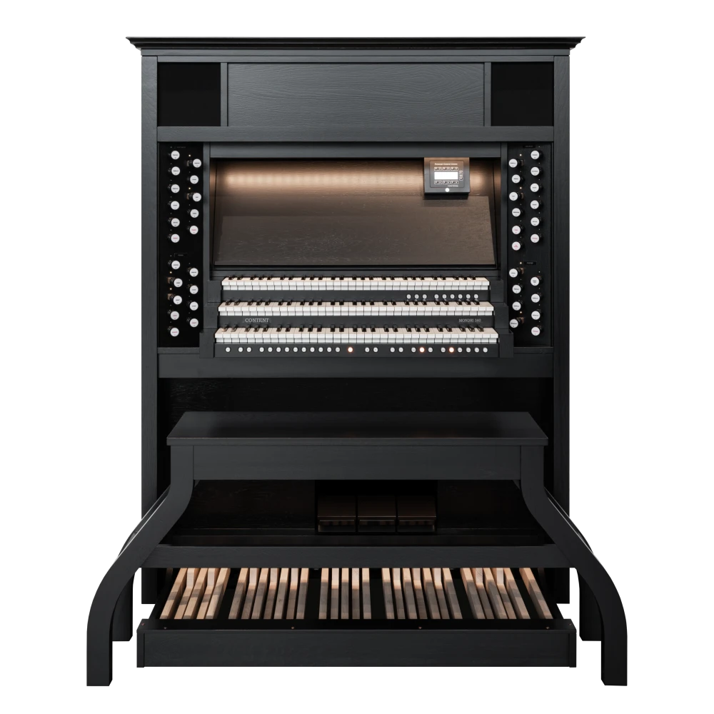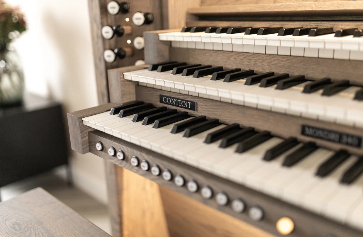 La serie Content Mondri ha sido una elección bien establecida y consistentemente apreciada entre los organistas durante muchos años. Estamos emocionados de presentar un nuevo modelo a nuestra colección: ¡el Mondri 340! Elaborado con pasión y la atención al detalle que esperas de Content. Con tiradores de madera, integrados en un robusto gabinete positivo hecho de auténtica madera de roble, el Mondri proporciona la experiencia de un órgano de tubos. Con altavoces en la parte inferior, delantera y superior del instrumento, la proyección del sonido se acerca a la sensación de una gran iglesia. Los modelos Content Mondri están disponibles en varias configuraciones. Puedes elegir entre elegantes cornisas, un elegante banco de órgano, teclados con revestimientos de madera o la adición de voces orquestales como flauta de pan, trompeta, piano y docenas de otras voces. Los teclados estándar incorporados sensibles al tacto completan los órganos Mondri.