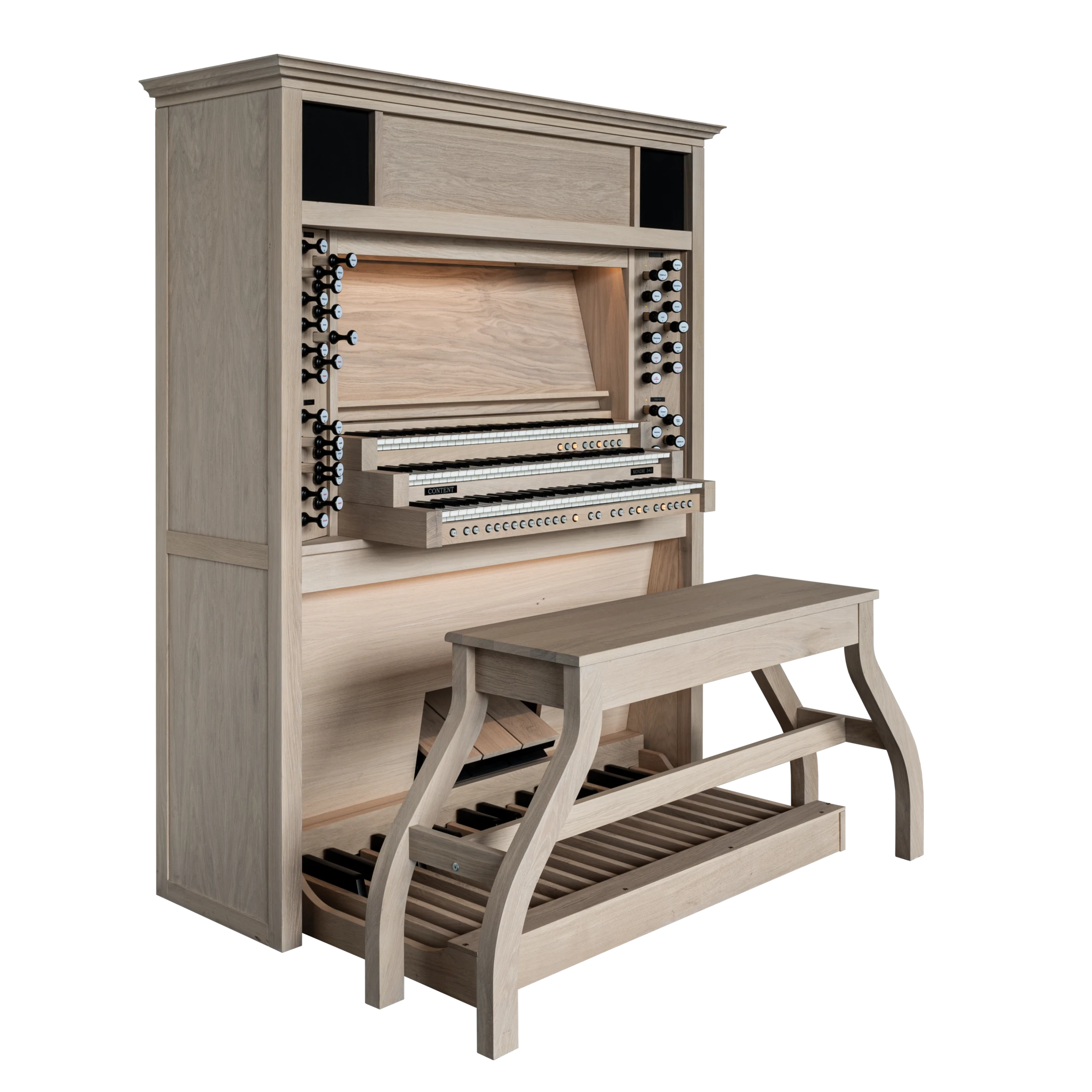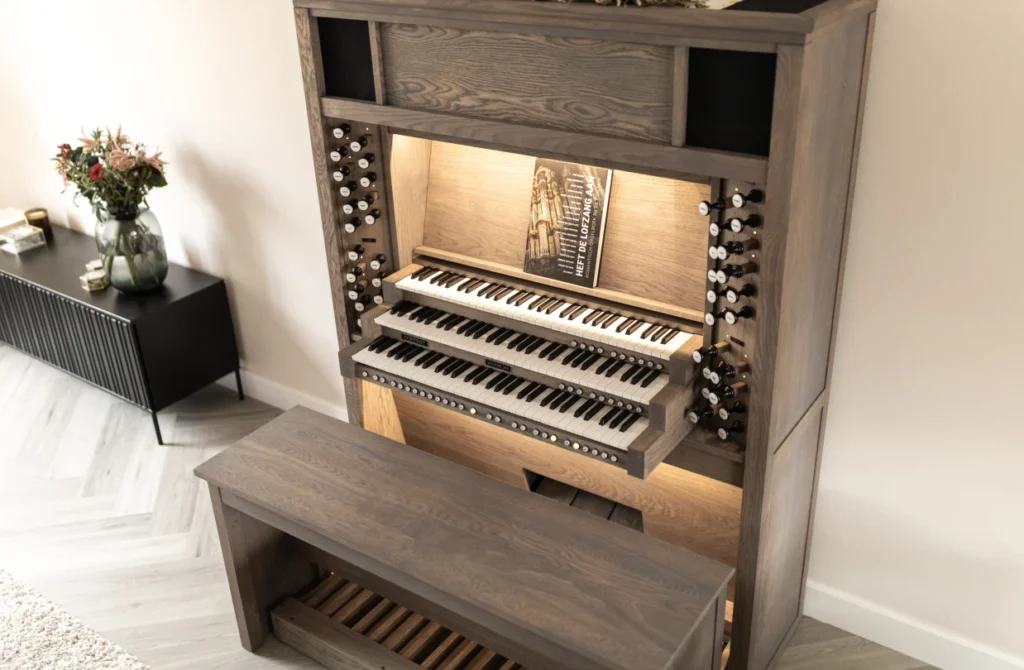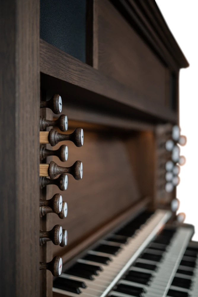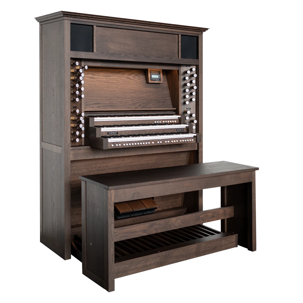 El gabinete de madera de roble bellamente diseñado hace una declaración impresionante en cualquier sala de estar y está equipado con tiradores de madera con indicación LED. El órgano cuenta con detalles como iluminación LED cerca del pedal y encima del atril de música, tres pedales de expresión de madera y una banqueta de madera con almacenamiento para partituras. También hay almacenamiento de partituras detrás del atril de música. El gabinete está diseñado con una estética moderna pero se puede personalizar para tener una apariencia más clásica según las preferencias, agregando una de las muchas cornisas, molduras, un banco de órgano de estilo francés o esquinas biseladas.