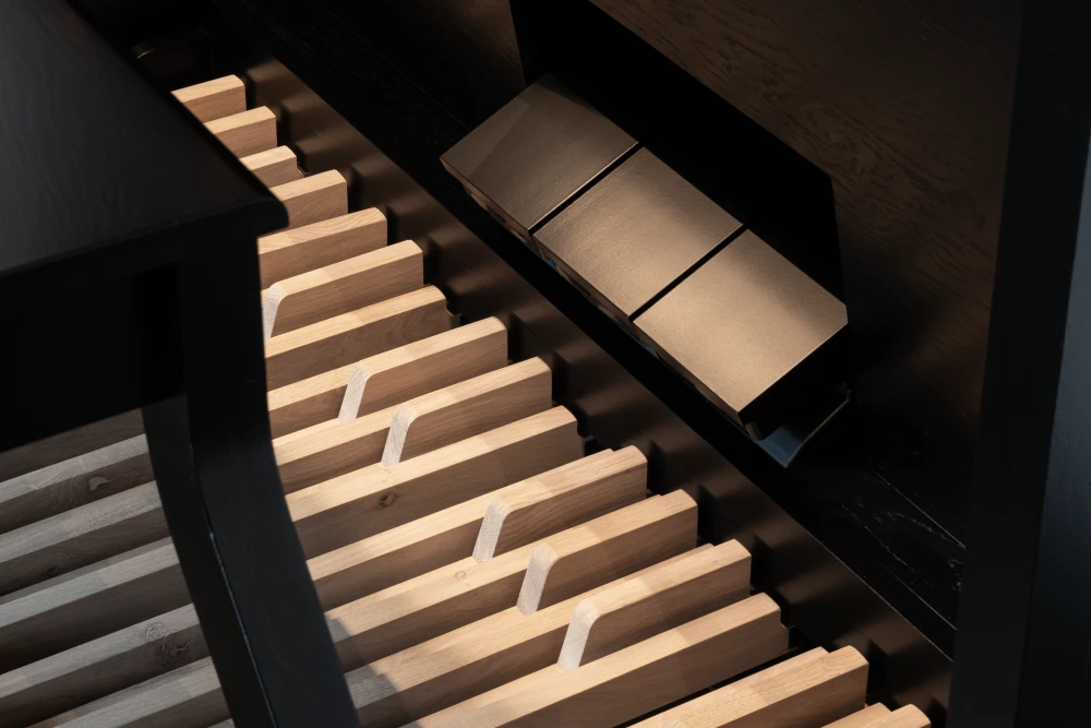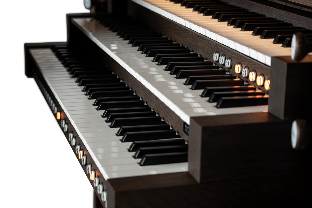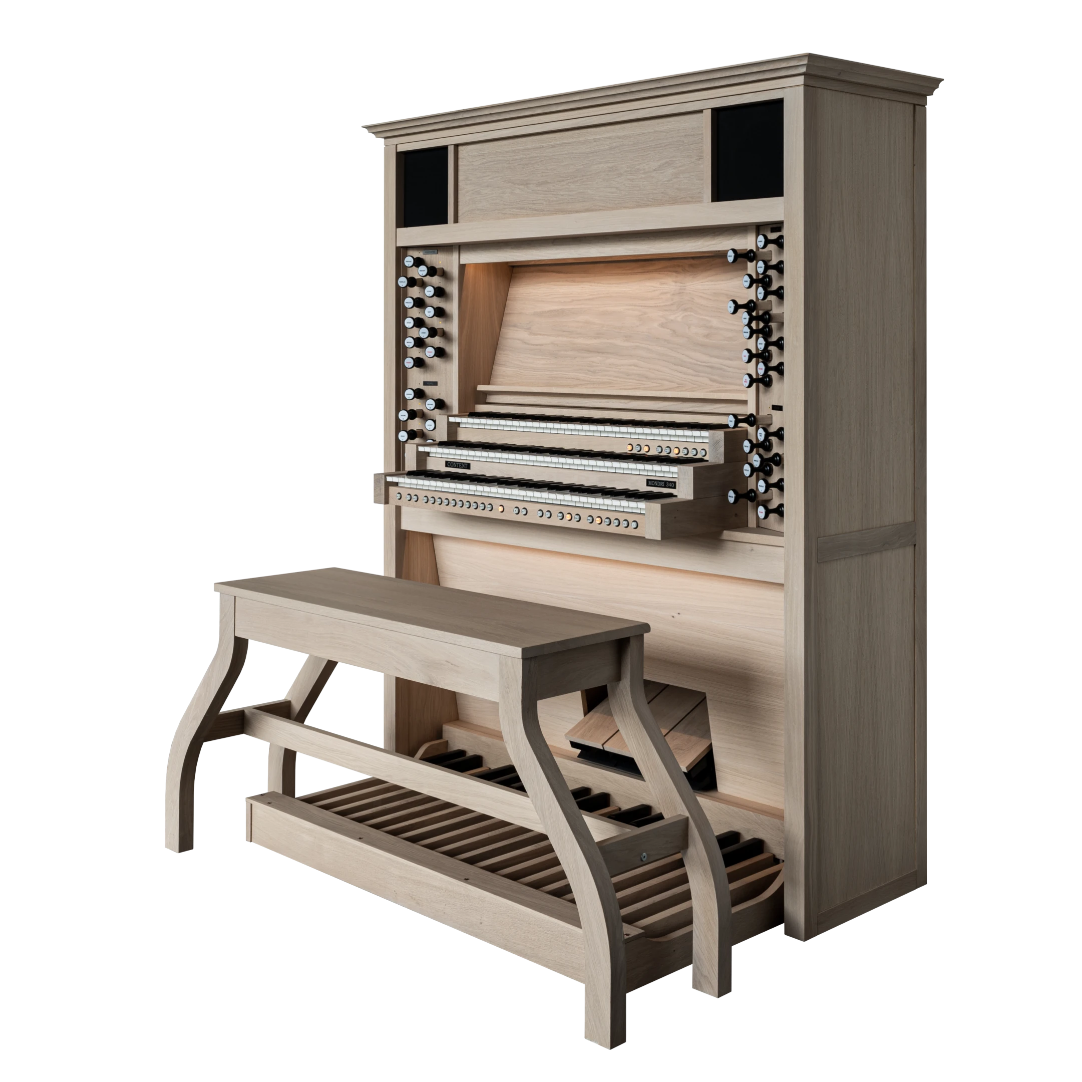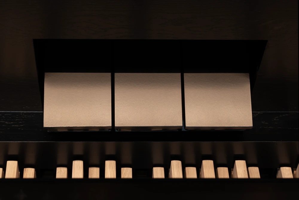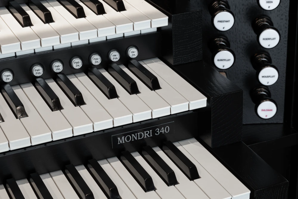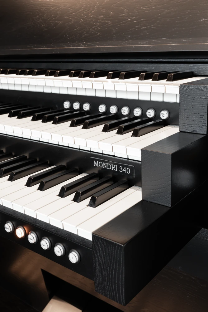 El Mondri 340 es la variante de tres manuales de la colección Mondri. Los 40 registros proporcionan al organista una amplia gama de posibilidades. Registrar con los tiradores de madera completa la experiencia. El Mondri 340 cuenta con un sistema de audio de varios canales con canales de sonido envolvente separados. Con solo presionar un botón, puedes determinar tu posición auditiva en el espacio virtual de la iglesia. Las condiciones acústicas se ajustan automáticamente a tu elección. También son audibles las diferencias en las posiciones de las divisiones. La división Swell en la parte superior del mueble del órgano suena distante en comparación con los registros del Positive, que a menudo se encuentra detrás de la espalda del organista. Esto añade dinámicas adicionales a las distintas posiciones auditivas.