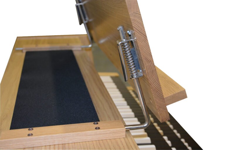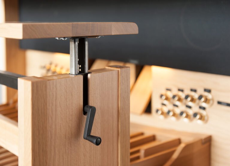 El banco es uno de los componentes más importantes para la comodidad del organista, ya que una postura adecuada es clave para una ejecución precisa. Content fabrica, en combinación con el acabado específico de cada órgano, un modelo de banco es ajustable en altura, lo que permite a cada organista configurarlo a la posición más ergonómica.