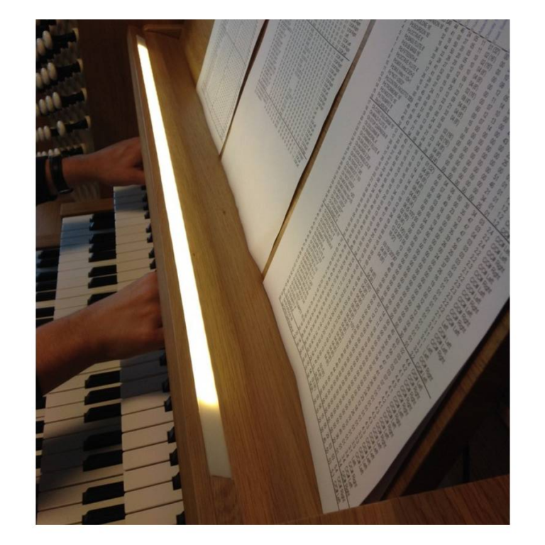 El atril puede incluir iluminación LED integrada, lo que facilita la lectura de las partituras en condiciones de baja iluminación. Esta luz suave y uniforme minimiza las sombras, mejorando la concentración del organista sin generar distracciones.